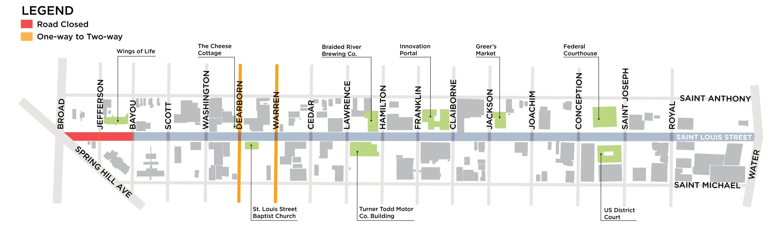 On Monday, September 22, St. Louis Street will close from Springhill Avenue to Bayou Street. Bayou Street will remain open for approximately two weeks, at which point Springhill Avenue to Scott Street will be closed.